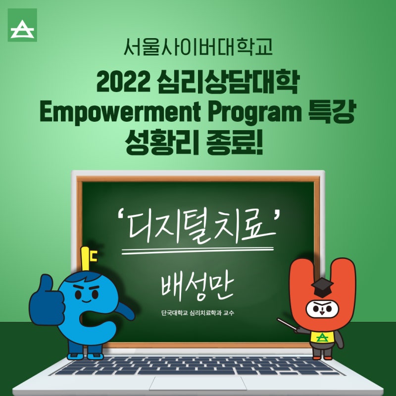 서울사이버대학교 2022 심리상담대학 임파워먼트 특강이 성공적으로 마무리 되었습니다 단국대학교 심리치료과 배성만 교수가 온라인 대학으로 2년 연속 최다 수강생으로 선정되었습니다! 1월 11일(수) 입학 지원 마감 서둘러!