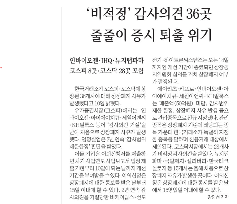 제한된 의견(한정의견)이란 감사인이 일반적이지 않은 특정 중요한 영역에서 충분하고 적절한 감사증거를 수집하지 못하거나 재무제표의 왜곡표시에 포함된 경우에 발생하는 의견입니다. 일반적으로 감사관의 의견 코스피 및 코스닥 상장기업의 경우 관리항목을 제외하고는 다음과 같이 의견을 표명한다. 코스닥 상장기업의 2회계연도 상장폐지 기준이기도 하다.