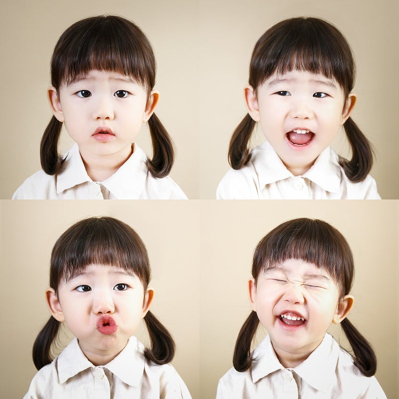 소품과 색상을 조정하여 동일한 배경과 옷에 다양한 사진이 제공됩니다.